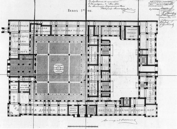 План 1-го этажа Почтового Стана Самусьев Г.Е. 1923 Санкт-Петербургский почтамт и его строители, (между 18 и 19 стр.)