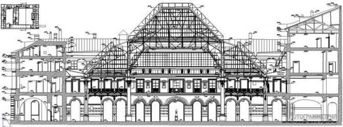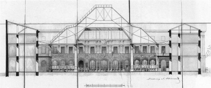 Проект и перестройка были поручены Гражд. Инж. Л.И. Новикову, который и соорудил на месте прежнего двора Почтового Стана, на котором когда-то полукругом были расположены уборные, обширный зал площадью в 260 кв. саж., перекрыв его сплошным стеклянным потолком.