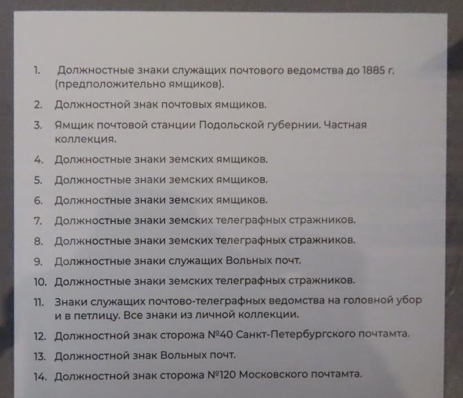 В 1913 г. на Почтамте висели уведомления, они сообщали петербуржцам, что корреспонденция, опущенная в ящик до шести с половиной часов вечера, отправляется в тот же день вечерними скорыми поездами; что все почтовые ящики в черте города очищаются 9 раз в сутки; указывались адреса всех 65 почтовых и телеграфных учреждений столицы. Здесь же находились таблицы, сообщавшие почтовые тарифы ("Весовой сбор"). (photogrammetria.ru/140-arhitekturnye-obmery-glavpochtamt.html)