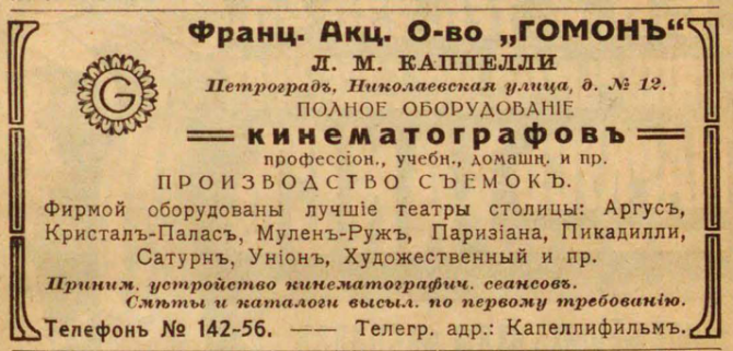 1913: Кинематографические принадлежности. Каппелли Люциан Марк. Николаевская 12 (ВПб на 1913 О. II С. 1189) 1913: Кинематографические принадлежности. Либкен Григ. Ив. (прокат. конт.) Николаевская 12 (ВПб на 1913 О. II С. 1189) 1915: Кинематографические принадлежности. Каппелли Люциан Марк. Николаевская 12 (ВПг на 1915 О. II С. 1180)