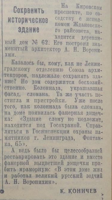 * 1922 - 1936. Дом Воронихина. Каменноостровский пр., д.62. 1807 г., реконстр. в 1879, в 1893 надстр. 2-й этаж. Разобран для реставр. в 1980 г. Дом Воронихина. Главный фасад. Государственная инспекция по охране памятников Ленинграда (goskatalog.ru) ** 1961. Кировский пр., 62. Бывшая дача архитектора А.Н. Воронихина. Воронихин жил на даче, построенной по его чертежам в 1809 - 11 гг. из строительных лесов Казанского собора (разобрана в 1980 г.)