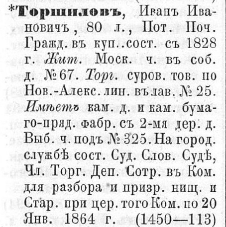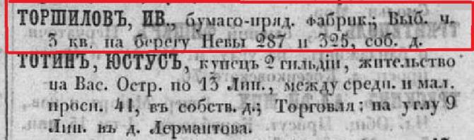 Иван Иванович Торшилов со своей Бумаго-Прядильной Фабрикой в Выборгской части 3ий квартал