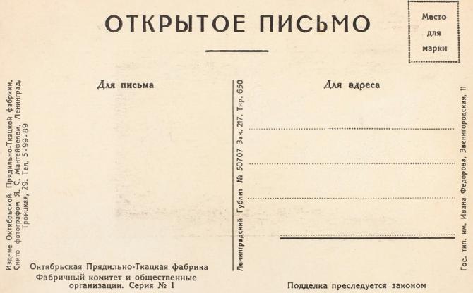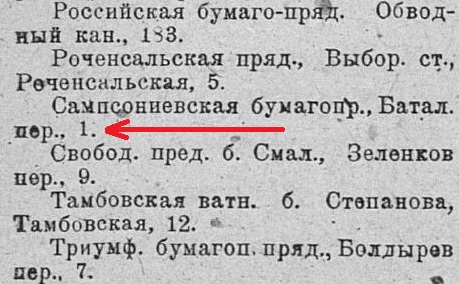 1918: Сампсониевская бумагопрядильная и ткацкая мануфактура, Акционерное Общество Сампсониевскойбумагопрядильной мануфактуры, Правление, 1861, Баталионный пер., 1. (Списокъ фабрично-заводскихъ предпріятій Петрограда, апрель 1918 г. Петроградъ. 1918, С. 3, № 34) 1923: Октябрьская Прядильно-Ткацкая фабрика, (б. Сампсониевская Прядильно-Ткацкая), Батальонный пер., 1. («Весь Петроград - 1923". С. 121). 1924: Октябрьская Прядильно-Ткацкая фабрика, Выборгская ст., Батальонный пер., 1. («Весь Ленинград - 1924", С. 241). В 1925 г. Октябрьская фабрика в справочнике ВЛ-1925 отсутствовала, возможно, она находилась в Управлении Консервированных фабрик Ленинградтекстиля. (Ленинградсохранфабтекстиль), Петроградская наб., 34. («Весь Ленинград - 1925", С. 301). 1926: Октябрьская Прядильная фабрика, Выборгская ст., Баталионная, 1. (Весь Ленинград - 1926", С. 333), 1927, 1928: Октябрьская Прядильно-Ткацкая фабрика, Выборгская ст., Баталионный пер., 1. («Весь Ленинград - 1927", С. 361), («Весь Ленинград и область- 1928", С. 413) 1929, 1930, 1931, 1932, 1933: «Октябрьская» Прядильно-ткацкая фабрика, Выборгская ст., Баталионный пер., 1. («Весь Ленинград и область - 1929", с. 423), («Весь Ленинград и область - 1930". С. 437), («Весь Ленинград - 1931". С. 368) («Весь Ленинград - 1932". С. 204), (Весь Ленинград - 1933". С. 132). 1934: Октябрьская Прядильно-ткацкая фабрика, (б. Сампсониевская мануфактура), Баталионный пер., 1. (Весь Ленинград - 1934". С. 94). 1935, 1937: Октябрьская Прядильно-ткацкая фабрика, Баталионный пер., 1. (Весь Ленинград - 1935". С. 98), (1937- Ленинград список абонентов", С. 282),. 1939, 1940: «Октябрьская» Прядильно-ткацкая фабрика, Баталионный пер., 1. («Ленинград - 1939", С. 134), («Ленинград - 1940", С. 171). 1965, 1973: Прядильно-ткацкая фабрика «Октябрьская», Батальонный пер., 1. ([], С. 195), ([], С. 213). 1978: «Октябрьская» Прядильно-ткацкая фабрика объединения Ленхлоппром, Баталионный пер., 1. (Список абонентов ЛГТС-1978", С. 284). 1988: «Октябрьская» Прядильно-ткацкая фабрика объединения «Ленхлоппром», пр. Карла Маркса, 32. ([], С. 96). ([], С. 512).