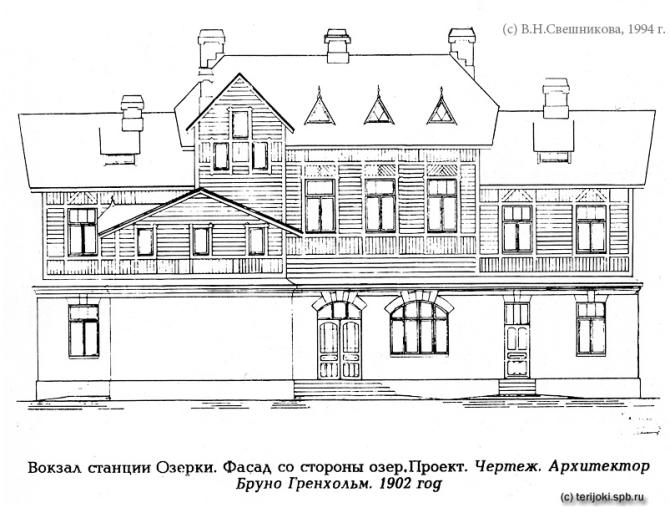 * Первый вокзал Озерки был построен, предположительно, в 1877 г., одновременно с открытием остановочного пункта пассажирских поездов. Он просуществовал до 1902 г., когда был заменён более капитальным строением, возведённым по проекту архитектора Бруно Гранхольма (terijoki.spb.ru)