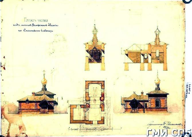 Часовня над могилой Ксении Блаженной была возведена в1900- 1902 гг. по проекту архитектора А. А. Всеславина в неорусском стиле. Она была освящена 12 октября 1902 г.