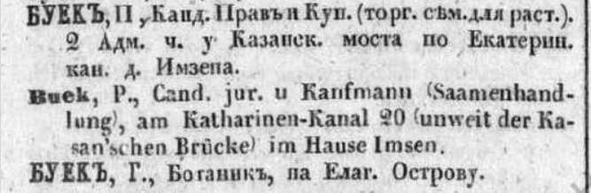 Смущает то, что в Путеводителе 1854 г. – «ботаник», проживающий «на Елагином острову», обозначен как Буекъ Г., а Буекъ П. - купец (торговля семенами для растений), проживающий в доме Имзена у Казанского моста по Екатерининскому каналу.