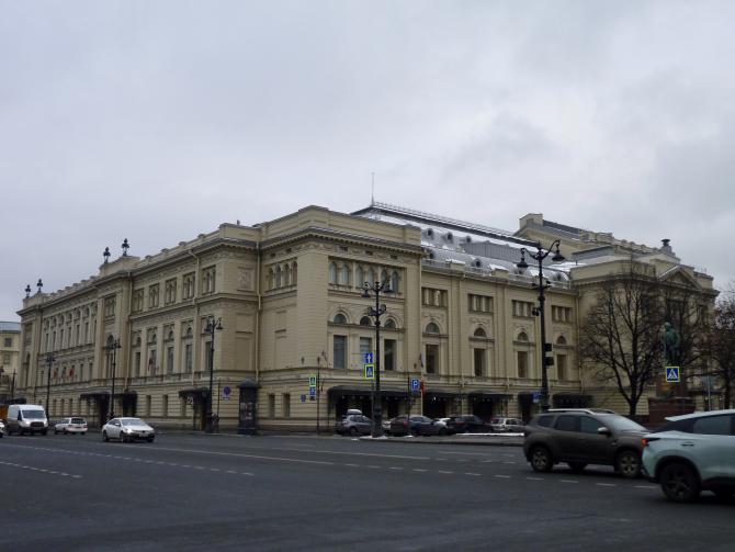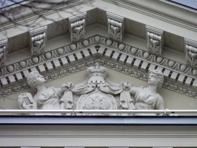 В 1912 г. Главный фасад Большого зала был несколько изменен и в таком виде дошел до наших дней. Оформлен он довольно сдержанно. В основном его украшают пилястры ионического ордера. Царский подъезд, смещенный несколько вправо, сохранив прежние размеры, изменил свое оформление. Его выделили колоннами ионического ордера и треугольным фронтоном. Во внутреннем поле фронтона (тимпане) - две лепные женские фигуры с лирами. (Лит.: Зуев Г. И. Там, где Крюков канал... М.: ЗАО Центрполиграф, 2007)
