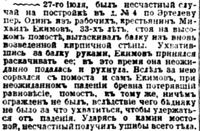 В 1836 г. арх. Д. Б. Ламони надстроил и перестроил дом купеческой жены Поповой, ныне дом № 4. На улицу «смотрел» трехэтажный, в десять окон дом, окруженный деревянными домиками с оградой и воротами. В 1841 г. Ламони построил во дворе слева большой пятиэтажный флигель, дошедший до наших времен. Как выглядел дом в 1860-е гг., можно судить из описи в архивном деле от 2 января 1862 г.: он состоял из «лицевого трехэтажного дома, выходящего на улицу и имеющего деревянные ворота с обеих сторон; каменного флигеля во дворе без подвалов в 6 этажей и одного каменного четырехэтажного дворового флигеля без подвалов, с мезонином». Кроме каменных во дворе дома были и деревянные флигели, которые комиссия не приняла в оценку из-за их ветхости и по причине «воспрещения исправлять и поддерживать деревянные постройки в Литейной части». В каменном лицевом доме и двух каменных дворовых флигелях насчитывалось 42 квартиры: от двенадцатикомнатной до двухкомнатных. В доме на тот момент была лишь одна парадная лестница в подъезде, выходившем в Эртелев переулок. До 1881 г. Дом принадлежал сначала тайному советнику, шталмейстеру Двора его величества Николаю Петровичу Хрущову, а затем еще 12 лет, до 1893 г., его сыновьям. После смерти Н. П. Хрущова 5 марта 1882 г. принадлежавшее ему имущество, согласно завещанию, перешло к сыновьям – статскому советнику Николаю Николаевичу и коллежскому советнику майору Александру Николаевичу Хрущовым. Из новой описи с оценкой принадлежащего Хрущовым дома, произведенной в ноябре 1882 г. архитектором А. И. Ковшаровым, мы узнаем, что за 20 лет, прошедших с последней оценки дома, в нем произошли некоторые изменения: на один этаж надстроен лицевой дом, разобраны деревянные дворовые флигели, улучшились бытовые условия жильцов. Произошла и перепланировка квартир: больше всего стало уже не шестикомнатных, а четырехкомнатных квартир. Хрущовы в 1893 г. продали этот дом почетному гражданину Василию Трифоновичу Ефимову и потомственному почетному гражданину Николаю Аполлоновичу Самарину. В деле представлен документ, из которого следует, что 11 декабря 1893 г. была «совершена крепость на недвижимость имущества бывшего майора, а ныне коллежского асессора Александра и статского советника Николая Николаевичей Хрущовых». Новые владельцы значительно расширили приобретенное ими имущество постройкой четырехэтажного каменного лицевого дома с таковым же надворным флигелем. В. П. Ефимов и Н. А. Самарин владели этим домом 12 лет. В 1905 г. они продали его провизору Бернгарду Матвеевичу Шаскольскому. Новый домовладелец продолжил перестройку дома. В отзыве от 17 декабря 1904 г. архитектор Д. А. Шагин, в очередной раз оценивавший дом, называет новую постройку: «каменный двухэтажный флигель по левой границе двора на нежилом подвале с чердачным помещением, приспособленным для склада», и кроме того, проводится ремонт дома. 27 января 1911 г. имущество, принадлежавшее Бернгарду Моисеевичу Шаскольскому, по его духовному завещанию перешло во владение вдовы провизора Евгении Морисовны (Михайловны), горного инженера Владимира, окончившего курс Петроградского университета, Павла, приват-доцента того же университета Петра и личного почетного гражданина Михаила Бернгардовичей Шаскольских с сохранением пожизненного владения за Евгенией Шаскольской. Бывшие домовладельцы, потомственные поч