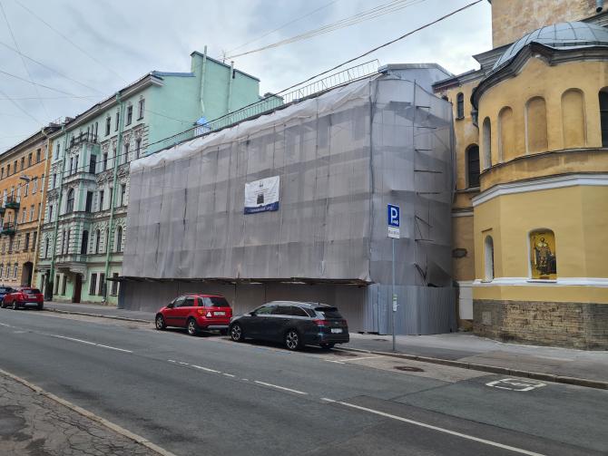 В Энциклопедии СПб. говорится также: "Церковь, как и находившийся рядом флигель для монахов, возводил в ярославском стиле XVII века епархиальный зодчий Н. Н. Никонов". Дом 14 с ярославским стилем 17 в. явно не имеет ничего общего. Должно быть, это и есть тот дом, в котором жила сама Джамусова. Вопрос - что было на том месте, на углу, где были потом возведены строения подворья?