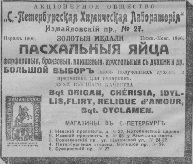 ВП на 1896 г. (О. II C. 828) в разделе "Парфюмерия": Санкт-Петербургская химическая лаборатория. Высочайше утвержденное общество. Измайловский, 27