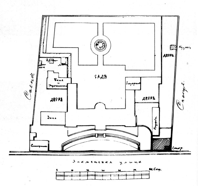 датируется 1848 годом, но такая датировка явно ошибочна, чертеж более поздний: бассейн в саду появился в 1864 г. (см. далее), а флигель на красной линии Знаменской улицы (с надписью "Смотритель") - в 1865 г.