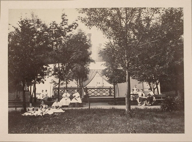 В 1864 г. посередине сада был устроен фонтан с бассейном для купания воспитанниц ((1), с. 50; (2), с. 53). Бассейн с фонтаном виден издалека на первой фотографии. А вот его вид вблизи: