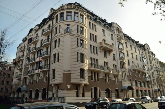 Жилой дом Ретроспективизм Пушкарский пер., 9А - ул. Ленина, б/н 2005 - арх. Дюндин А.В. Дом построен в стиле Модерн.