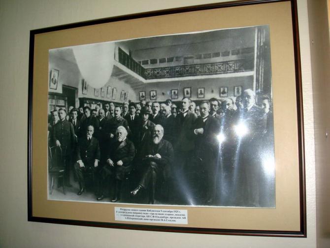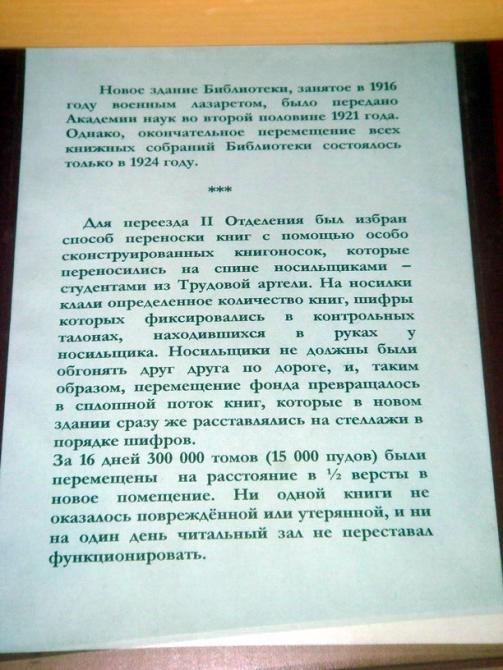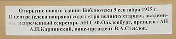 «Библиотека Академии наук была основана в 1714 г. по указу Петра I. В 1718 г. Библиотека была размещена в «Кикиных палатах». В 1728 г. Библиотека была открыта для посетителей в новом здании на Васильевском острове. В этом здании Академия наук помещалась до 1787 г., Библиотека - до 1924 г., а Кунсткамера находится и поныне.