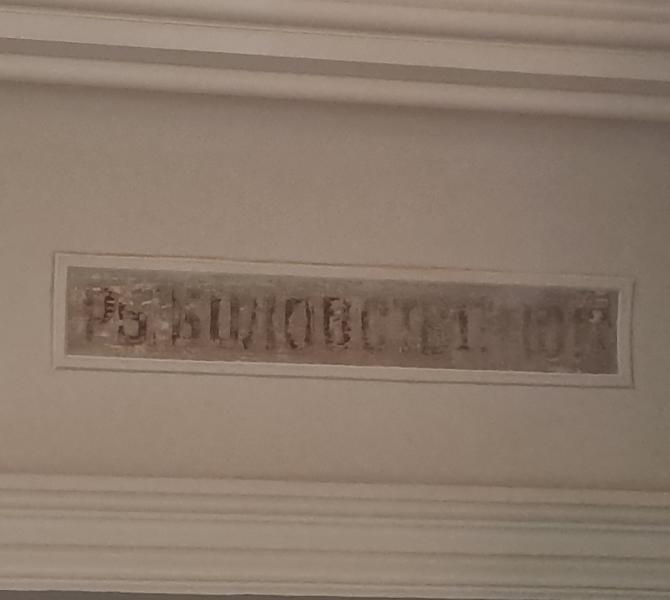 В большом зале, в одном из углов под потолком можно увидеть такую надпись со времен сельскохозяйственного музея.