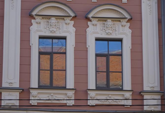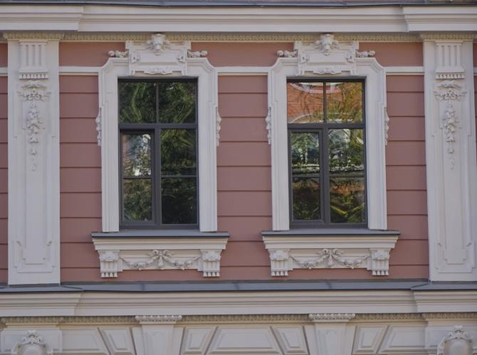 Плоский фасад дома обильно украшен декором в стиле зрелой эклектики. Оконные проемы оформлены наличниками с "ушками", лучковыми и прямыми сандриками. Боковые ризалиты увенчаны аттиками и оформлены пилястрами, декорированными гирляндами. Первый этаж обработан мощным рустом и отделен от остальных этажей карнизом. Пятый, надстроенный позднее, этаж выдержан в более скромных формах ранней эклектики. Окна отделаны наличниками с замковыми камнями, фасад обработан дощатым рустом и скромными пилястрами дорического ордера без баз. (Алексей von Fricken)