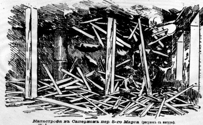 11876 просмотровДва молодых плотника погибли во время проведения работ в перестраиваемом доме по Саперному переулку, засыпанные обломками обрушившегося потолка. Потолок не был снесен вовремя и внизу продолжали жить, хотя вверху надстраивались четыре этажа. Риск, говорят, благородное дело, и экономия вещь хорошая, но две молодые жизни все-таки погибли…