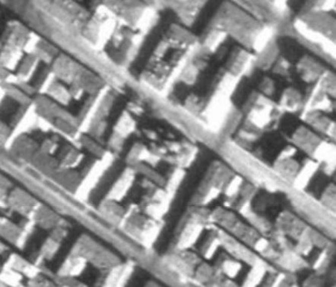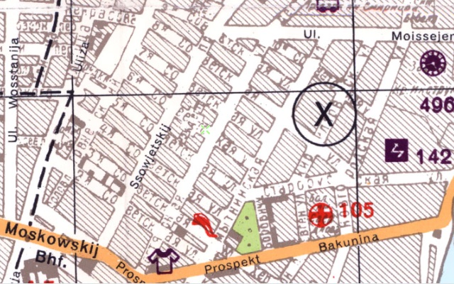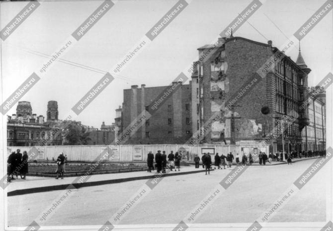* Разрушения и пустырь на углу Суворовского проспекта и 6-й Советской улицы, слева - разрушенная церковь Благовещения Пресвятой Богородицы ( архитектор Н. Н. Никонов 1889-1893 гг.). Дата съёмки: