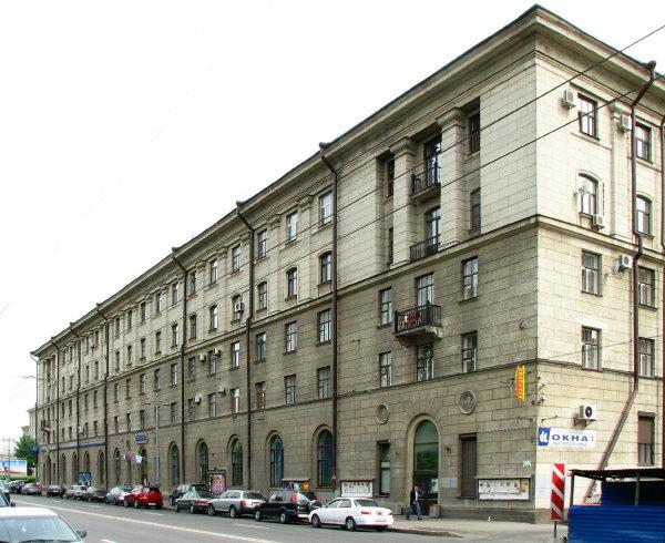 Реконструируемое здание, построенное в начале 1950-х гг., имеет 5 этажей, подвал и неотапливаемый чердак. Встроенные помещения размещаются на 1 этаже и частично (банк) в подвале и на 2 этаже. В целом расположение встроенных помещений сохраняется. Жилые этажи - 2-5. Несущие стены - продольные, за исключением центральной части, представляющей собой неполный каркас с несущими центральными колоннами и наружными кирпичными стенами. Наружные стены 1-3 этажей кирпичные толщиной 640 мм ( со штукатуркой 700 мм), 4 и 5 этажей - из шлакоблоков толщиной 540 мм (со штукатуркой 600 мм). Внутренние стены всех этажей кирпичные толщиной 510 мм (со штукатуркой 580-600 мм). Перекрытия в основном выполнены из шлакобетонных плит по железобетонным балкам таврового сечения, частично - из монолитного железобетона по металлическим балкам. Лестницы выполнены из сборных железобетонных ступеней по металлическим косоурам. Кровля - металлическая по деревянным стропилам. В ходе реконструкции здания возведены 2 новые лестничные клетки с лестницами из сборных ступеней по металлическим косоурам, установлены 5-ти лифтов в металлокаркасных шахтах, полная замена в жилой части здания ненесущих перегородок, полов, оконных и дверных блоков. Квартир - 54, общая площадь квартир - 60х62 кв. м.