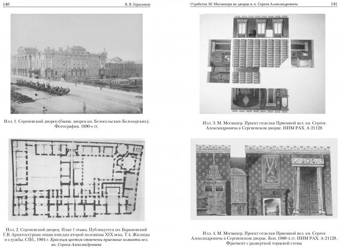 Герасимов В. К постановке вопроса о работах М.Е. Месмахера во дворце вел. кн. Сергея Александровича в Санкт-Петербурге// Месмахеровские чтения-2017: материалы междунар. науч. - практ. конф., 21-22 марта 2017 г.: сб. научн. ст.. СПб., 2017. С.11.