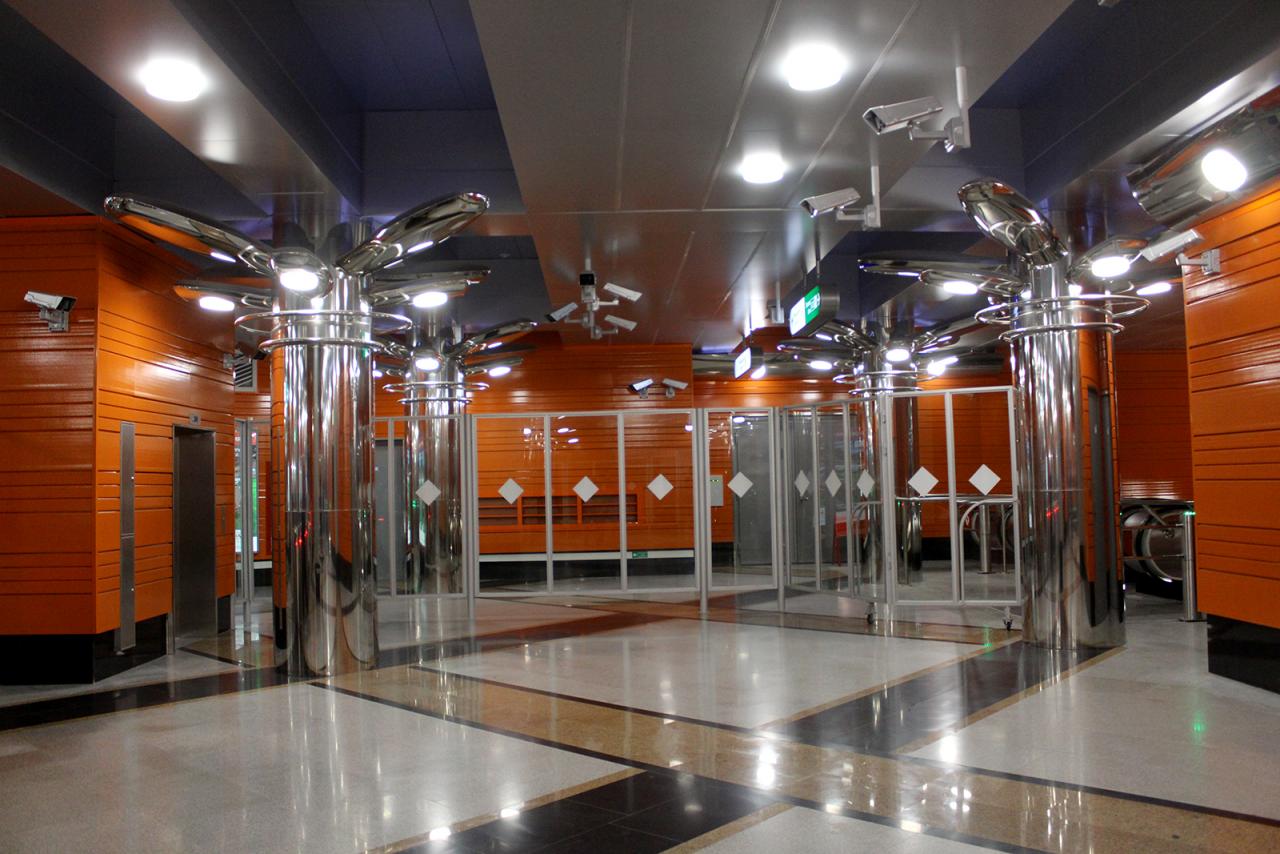 Организация движения в вестибюле предполагается с обособлением входных и выходных пассажиропотоков. Таким образом, с учетом компоновочной схемы станции и наличия боковых посадочных платформ, выходы с платформ обособлены и до уровня земли отделены от встречных пассажиропотоков. Входы и выходы в наземные павильоны вестибюлей разделены. В каждом из павильонов проектом предусмотрено по 6 дверей (3 на вход и 3 на выход).