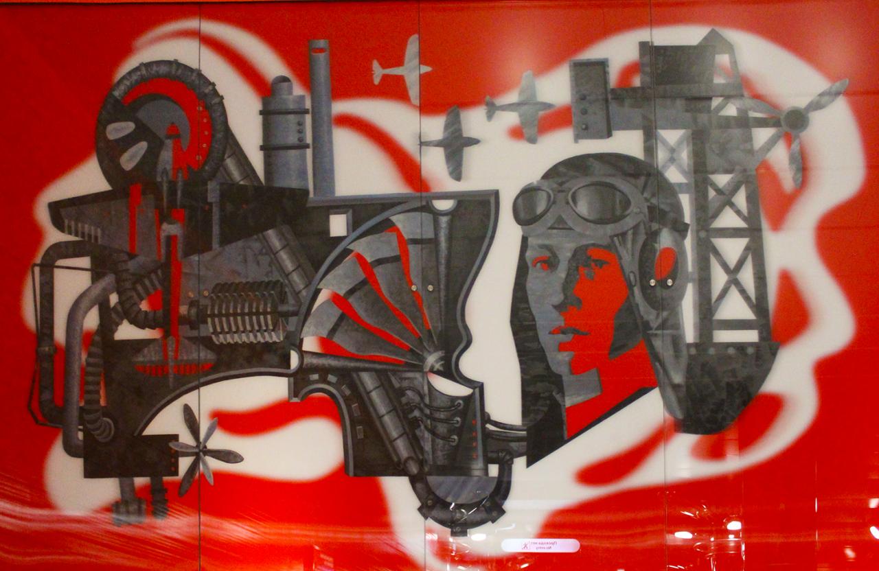 Повеселила как всегда Вики - архитектурное оформление связано с темой современной индустриальной урбанистической среды, характерной для района размещения станции- по-моему такое писали про Обводный канал.