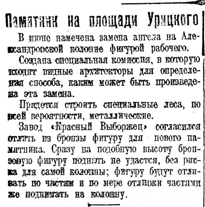 В послереволюционное время Ангела закрывали брезентовым колпаком, окрашенным в красный цвет, маскировали шарами, спускаемыми с зависающего дирижабля. Готовился проект установки вместо ангела огромной статуи В. И. Ленина. Но провидению было угодно, чтобы ангел сохранился. В годы Великой Отечественной войны монумент укрыли лишь на 2/3 высоты и ангел получил ранение: на одном из крыльев - осколочный след. (Из статьи Н. Ефремовой "Александровская колонна" "Наука и жизнь" №7, 2002) В период блокады памятник поврежден осколками снарядов. В 1963 г. прошла реставрация (бригадир Н. Н. Решетов, руководитель работ – реставратор И. Г. Блэк). В 1977 г. асфальтовое покрытие вокруг Александровской колонны заменено диабазовой брусчаткой, воссозданы в первоначальных формах четыре фонаря по ее углам. В 2002-2003 гг. проведена комплексная реставрация. В 2004 восстановлена историческая ограда. Литература: