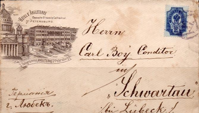Рекламное письмо "Отель Англетер": Санкт-Петербург - Швартау ( Германи ). Франкировано маркой 10 коп