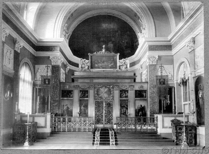 Церковь вмц. Екатерины Академия художеств основана Елизаветой Петровной в 1758 по инициативе гр. И. И. Шувалова. Здание академии было возведено на берегу Невы в 1764-1788 по проекту А. Ф. Кокоринова и Ж. Б. Валлен-Деламота при участии Ю. М. Фельтена. Церковь во имя прп. Иоанна Дамаскина, защитника иконопочитания, была заложена по проекту Деламота 28 июня 1765 митрополитом Новгородским Димитрием и архиепископом Санкт-Петербургским Гавриилом в присутствии Екатерины II. Храм располагался на втором этаже со стороны сада. Несмотря на это, студентам целых 55 лет приходилось пользоваться временным походным храмом Сошествия Св. Духа, который ранее принадлежал русскому гарнизону в Пиллау. Над постройкой церковного купола и помещения храма много потрудился в 1770-е Фельтен, но окончательной отделке помешали разные обстоятельства. Отделку первоначально поручили молодым выпускникам Академии - братьям Ивану и Алексею Алексеевичам Ивановым, но их предложения не были осуществлены.