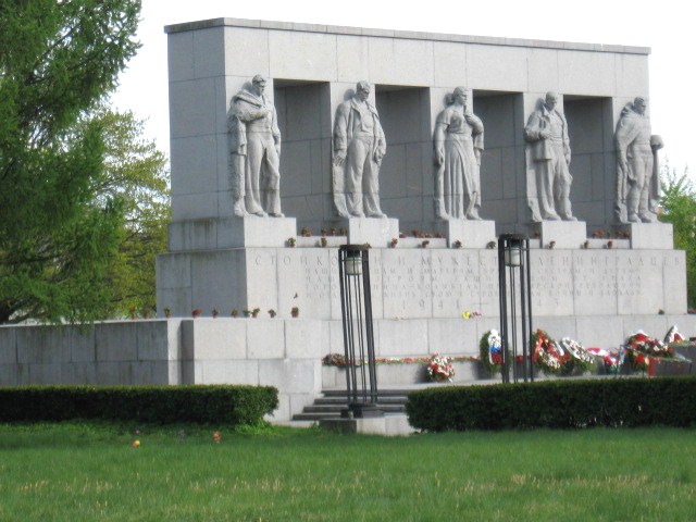 По другую сторону Центральной дороги, слева от входа, - первые участки кладбища. Здесь немало памятников военачальникам Военно-морского флота и преподавателям Военно-морской академии. Дальше по Центральной дороге, у церкви, сконцентрировано большинство исторических захоронений послевоенного времени. <…> Если от церкви следовать по Центральной дороге дальше, то за участком 16 справа открывается вид на братские воинские захоронения времен Великой Отечественной войны. Все они отмечены однотипными белыми обелисками. Более семисот стоявших здесь до недавнего времени скромных именных раковин в 1985 г. были сняты в соответствии с решением исполкома Ленсовета. В результате воинские захоронения стали безымянными - к немалому возмущению родственников погибших, и не только их. Кроме этих захоронений, на кладбище есть еще несколько памятников на могилах погибших воинов. За братскими военными захоронениями справа от Центральной дороги расположена Коммунистическая площадка. Здесь похоронены Герои Советского Союза, могилы которых находятся под охраной государства: Б. А. Алексеев (1909- 1972), Н И. Арчаков (1913-1961), И И. Афанасьев (1901-1952), А. И. Турин (1910-1962), П. И. Павлов (1908-1967) и И. С. Юмашев (1895-1972).