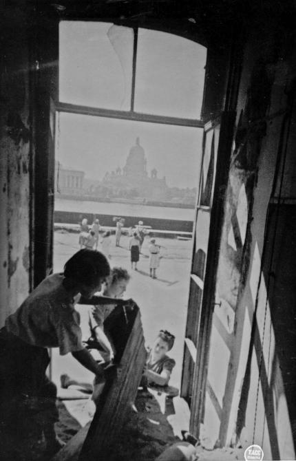 Студентки Государственного университета разбирают амбразуру в окне главного здания. 4 июля 1944 г. Фотограф С. Кропивницкий. Университетская наб., д.9