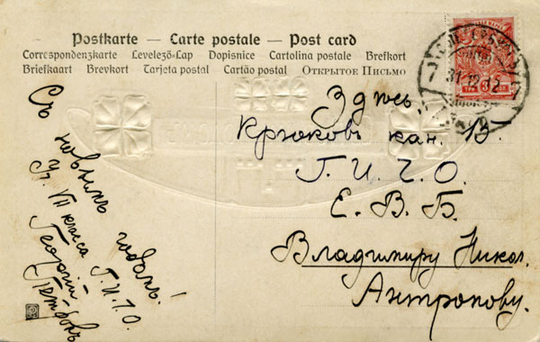 Адресат: Здесь. Крюков кан. 15 Г.И.Ч.О. Е.В.Б. Владимиру Николаевичу Антропову