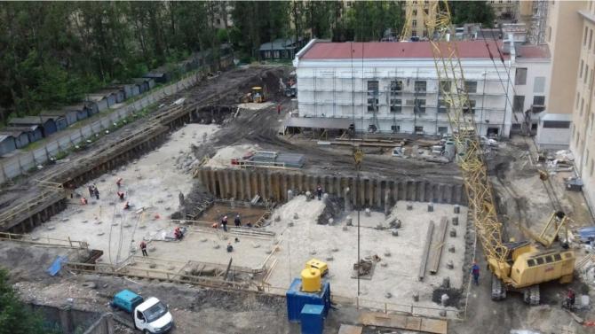 Тем временем продолжается строительство нового здания во дворе. Проектом также предусмотрен еще один корпус на месте сквера вдоль съезда от Малоохтинского проспекта к Заневскому. (kanoner.com 24.11.2017; )