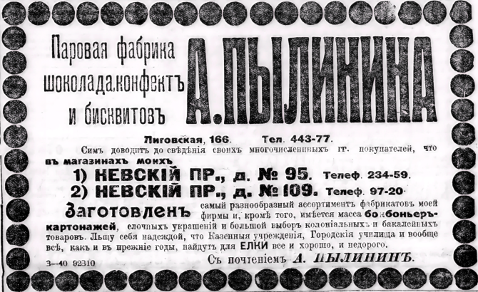 По ВПб на 1894 г. (O. I Ст. 168) владельцем участка был Степан Степанович Степанов. Справочник не сообщает о ним ничего, кроме адреса и домовладения. На 1903 г. (О. IV Ст. 171) вдладельцами уже указаны Горбачевы Василий, Федор и Иван Петровичи. В издании на 1909 г. владельцем становится Александр Арсеньевич Пылинин (О. IV Ст. 202) Пылинин впервые указывается в купеческой книге на 1903 г. (С. 518) книга сообщает, что он крестьянин Ярославской губернии, православной веры, образование домашнее, свидетельства выбирает с 1903 г; проживает в Казанской части, 2 уч. по по , содержит конфектную фабрику в доме жительства.. В ВПб на 1903 г. в разделе "Конфекты и шоколод" указана мастерская Зеленкова Федосия Антоновича и Пылинина Александра Арсеньевича на Казначейской, 5 (О. II. С. 1192). Однако, появился он в справочнике ВПб на 1898 г, (О. III С.437) проживал на Казанской улице, сменив несколько адресов. Возможно он работал у Зеленкова, мастерская которого указывается в справочнике начиная с издания на 1899 г. (О.II С. 1068). а в ВПб на 1901 г. Пылинин указан уже как партнер Зеленкова (О. II С. 1101). По куп. книге на 1904 г. (С. 527) А. А. Пылинин крестьянин Ярославской губернии, Угличского уезда, Неверковской волости села Борисовского проживает уже на Глазовской ул. 11, а конфектную фабрику содержит по Воронежской ул., 4, но в ВПб на 1904 г. (О. II C. 1185) указана по адресу В алфавитном отделе Пылинин назван кондитером (О. III С. 538), проживающим на Глазовской 11-3. В последующих изданиях купеческой книги А. А. Пылинин отсутствует и появляется только уже по этому адресу. В ВПб на 1905-1907 гг. заведение Пылинина в разделе "Конфекты и шоколод" II-го отдела отсутствует, в алфавитной части о нем указан только адрес - Глазовская. 11, а в 1908 г. конфектная фабрика снова указана на Лиговской, 123. В последующие годы справочники указывают фабрику и место проживания владельца по этому адресу по 1917 г. (Добавил: Наталия)