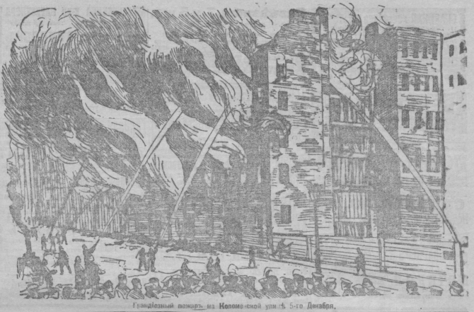 Громадный пожар на Коломенской улице. Пострадало 5 пожарных. Вчера, 5 -го Декабря, около полудня, загорелся огромный вновь строящийся 6-этажный с мансардами дом подрядчика строительных работ С. В. Васильева, под №№ 46-9-4, выходящий на Коломенскую, Глазовскую и Волоколамскую улицы.