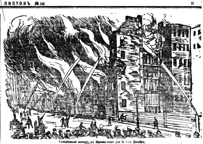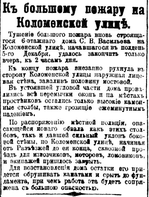 К большому пожару на Коломенской улице Тушение большого пожара строящегося 6-этажного дома С. В. Васильева на Коломенской улице, начавшегося в полдень 5-го Декабря удалось закончить только вчера, к 2 часам дня. К моменту пожара внезапно рухнула в сторону Коломенской улицы наружная лицевая стена, завалив половину мостовой. В устоявшей угловой части дома провалились все перемычки окон и на местах простенков остались только высокие каменные столбы, также грозящие ежеминутным падением. По распоряжению местной полиции, опасающейся нового обвала как этих столбов, так и давшей сильный уклон боковой стены, по Коломенской улице, начиная от Разъезжей до её конца, сквозной проезд для извозчиков, моторов, ломовиков и экипажей пришлось закрыть. Для возстановления дома остатки его придётся обрушивать канатами и срыть до фундамента, причём работа эта будет сопряжена с большой опасностью. (Петроградский листок. № 336. 7 декакбря 1914 г., С. 10) (добавил )