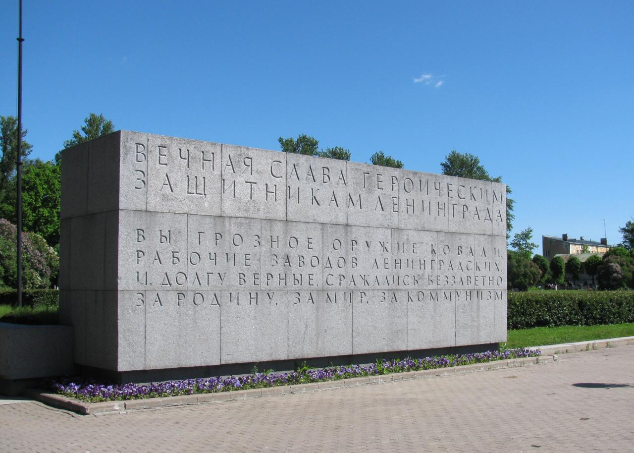 Справа от главного входа расположен мемориал жертвам блокадного Ленинграда. Он создан на месте шестнадцати братских могильных холмов и торжественно открыт 27 января 1965 г., в 21-ю годовщину снятия блокады. Общий проект некрополя разработал профессор Я. И. Лукин; скульптурные фигуры выполнили студенты ЛВХПУ им. В. И. Мухиной под руководством профессора Р. К. Таурита. В центре высится четырехпролетный портик на высоком цоколе, с пятью монументальными скульптурами, изображающими защитников и тружеников Ленинграда. Перед портиком - гранитный куб с зажженным Вечным огнем и площадка, вымощенная черным лабрадоритом. Авторы стихотворных эпитафий - М. А. Дудин, И. К. Авраменко, С. С. Орлов, О. Н. Шестинский. Подчеркнуто простой и в то же время торжественный мемориал гармонично обрамляет зелень газонов, кустарников и деревьев, стеной стоящих позади него (5).