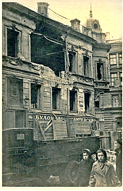 Характер и размеры поражения и разрушения - снарядом разрушена часть 3 и 4 этажей наружного флигеля.