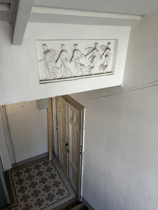 , описание объекта. На левой парадной № 3, выходящей в проулок без названия, фрагментарно сохранились витражи в двух трехстворчатых окнах. Боковые створки установлены под углом к центральной. Опорная подложка находится со стороны улицы. Свинцово-паечные витражи геометрического рисунка собраны из рифленого стекла, нарезанного под углом в 45° к направлению рифления, по периметру рамы проходит узкая полоса желтого стекла с фактурой «Muranese», на средокрестиях вставлены объемные элементы в виде стеклянных четырехугольных призм с полированными гранями. Поэтажная сохранность: на площадке 5-6-го этажа витражное полотно сохранилось в боковых фрамугах, в центральной фрамуге утрачены 10 стекол и 6 стеклянных призм, провисание протяжки, трещины, подложка разбита. На 6-7-м этаже витражное остекление имеется во всех фрамугах в хорошем состоянии, в левой створке окна незначительные повреждения стекол и подложки. Осмотр: Январь 2020 г. Все фото выполнены волонтерами проекта. (добавил )