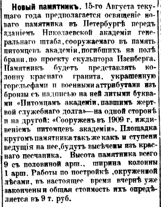 Закладка зданий академии Генерального штаба. 15-го июня, на Преображенском плацу происходило торжество закладки новых зданий Николаевской академии генерального штаба. Здания уже отчасти возведены на высоту первого этажа. Место для закладки избрано в центральном месте главного корпуса, близ парадного входа в академию. Для новых зданий милостью Государя отведен участок в 313,817 кв. саж. При разработке проекта новых зданий в основание приняты: а) возможность увеличения числа слушателей и следовательно большие размеры аудиторий; б) возможно большие удобства для занятий в практических упражнениях зимою, для чего специально будет устроен ряд комнат; в) возможность офицерам работать в течение всего дня, для чего при библиотеке кроме зал книгохранения будет еще особая читальня; г) необходимость упражнений в верховой езде, для чего будет своя конюшня; д) удешевление жизни обучающихся офицеров устройством буфетной; е) возможность военных развлечений: стрельба, фехтование, верховая езда и пр., для чего имеется обширный плац, просторные залы. Важно то, что новые здания специально сооружаются для академии, а не приспособляются, как было, из старых. Здание сооружается по проекту академика архитектуры А. И. фон Гогена. («Стоитель», 1900, № 11-14, Стб. 515-517, добавил )