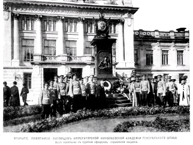 * Памятник офицерам, питомцам Николаевской военной академии, погибшим при исполнении своего долга, открытый перед зданием Академии