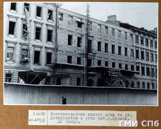 Разрушена была средняя часть по ул. Декабристов - см. . Вероятно, 1950 - это год восстановления именно той части. Парадную лестницу восстанавливать не стали, дверь вела в детский сад Адмиралтейского завода (или как он тогда назывался?), который занял весь бельэтаж от 1-го до 3-го подъезда. С улицы была устроена не общая лестница, а только вход - прежде в детский сад, теперь в заведение "Карлсон" (2017 г.). На этой же оси со стороны двора послевоенная лестница в квартиры 2-4 этажей. В старое время в среднем подъезде были квартиры с 9 по 15. Это если войти во двор с Пряжки - 2-я лестница справа. Детский сад был во второй парадной, средней по ул. Декабристов. ()