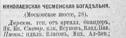 Открытие и заселение Чесменской военной богадельни (или Чесменского инвалидного дома), состоялось в годовщину Полтавской битвы 27 июня 1836 г. После смерти Николая I богадельня получила его имя.