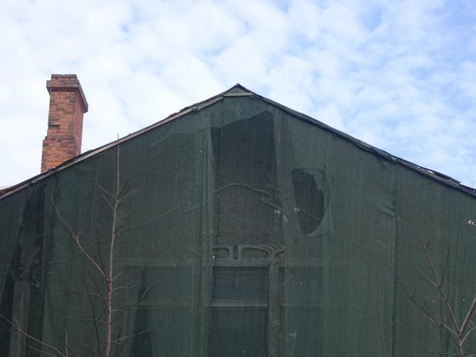 Широкие окна, стилизованный орнамент в простенках, темная фактурная штукатурка украшают здание. (по материалам [])