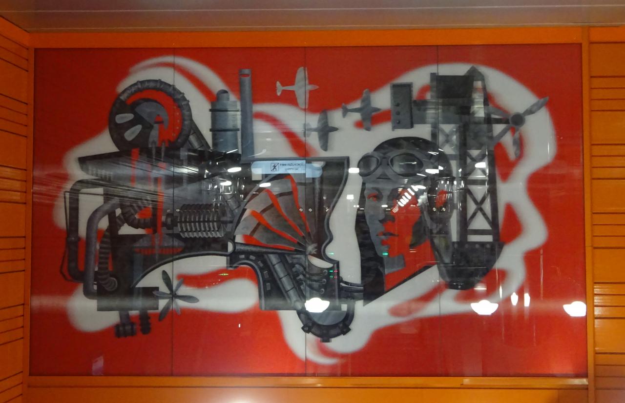 Повеселила как всегда Вики - архитектурное оформление связано с темой современной индустриальной урбанистической среды, характерной для района размещения станции- по-моему такое писали про Обводный канал.
