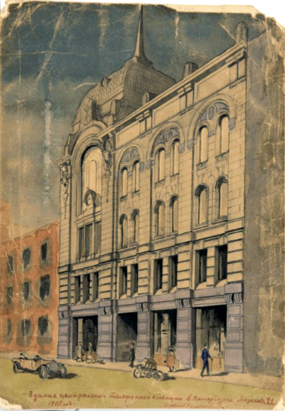 Работы по устройству здания новой центральной С.-Петербургской телефонной станции закончены. На фасаде его, выходящем на Морскую ул., первый этаж облицован красным песчаником, а следующие – белым. Увенчивается здание куполом с колоссальным гербом города. В арке, поддерживающей купол, устанавливаются больших размеров электрические часы. Все магистрали подземной телефонной сети сходятся в особой бетонной кабельной шахте, расположенной под станцией. Пока проведено 4 кабеля с свинцовой изоляцией, по 400 парных жил каждый. Через особое отверстие кабели проходят в первый этаж, где находятся распределительное и машинное отделения. Второй этаж занимают аккумуляторное отделение и техническая часть; на третьем помещаются столовая для телефонисток, раздевальная и комната для щитов со световой сигнализацией. В четвёртом этаже, в длинном двухсветном со сводами зале, устроена аппаратная, с двумя ярусами коммутаторных столов. Нова станция разсчитана на 40.000 абонентов, но в настоящее время коммутаторы поставлены с разсчётом только на 12.000 абонентов. С открытием действий станции абоненты будут разбиты на 2 группы. Нумерация первой начнётся с первого нумера, а второй с 20.001. Ко включению в последнюю группу предназначены абоненты, имеющие в настоящее время нумера свыше 3 600. Отопление во всех помещениях паро-водяное. Для нагнетания чистого воздуха устроены особые машины. Полное оборудование и начало действий предположено к 1-му декабря. По предварительному разсчёту постройка обойдётся около 3.000.000 руб. Кроме станции, в этом же здании помещаются торговая депутация, городская статистика и квартиры для отдачи в наймы, которые будут давать 18 000 руб. годового дохода.Здание построено по проекту архитектора К. В. Бальди. («Прав. Вестн.»). (Зодчий. 1904, № 39 (26 Сентября), стр. 435; добавил: )