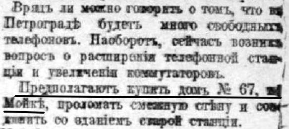 Работы по устройству здания новой центральной С.-Петербургской телефонной станции закончены. На фасаде его, выходящем на Морскую ул., первый этаж облицован красным песчаником, а следующие – белым. Увенчивается здание куполом с колоссальным гербом города. В арке, поддерживающей купол, устанавливаются больших размеров электрические часы. Все магистрали подземной телефонной сети сходятся в особой бетонной кабельной шахте, расположенной под станцией. Пока проведено 4 кабеля с свинцовой изоляцией, по 400 парных жил каждый. Через особое отверстие кабели проходят в первый этаж, где находятся распределительное и машинное отделения. Второй этаж занимают аккумуляторное отделение и техническая часть; на третьем помещаются столовая для телефонисток, раздевальная и комната для щитов со световой сигнализацией. В четвёртом этаже, в длинном двухсветном со сводами зале, устроена аппаратная, с двумя ярусами коммутаторных столов. Нова станция разсчитана на 40.000 абонентов, но в настоящее время коммутаторы поставлены с разсчётом только на 12.000 абонентов. С открытием действий станции абоненты будут разбиты на 2 группы. Нумерация первой начнётся с первого нумера, а второй с 20.001. Ко включению в последнюю группу предназначены абоненты, имеющие в настоящее время нумера свыше 3 600. Отопление во всех помещениях паро-водяное. Для нагнетания чистого воздуха устроены особые машины. Полное оборудование и начало действий предположено к 1-му декабря. По предварительному разсчёту постройка обойдётся около 3.000.000 руб. Кроме станции, в этом же здании помещаются торговая депутация, городская статистика и квартиры для отдачи в наймы, которые будут давать 18 000 руб. годового дохода.Здание построено по проекту архитектора К. В. Бальди. («Прав. Вестн.»). (Зодчий. 1904, № 39 (26 Сентября), стр. 435; добавил: )