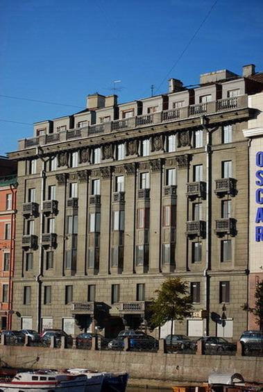 Это здание построено на месте старого ампирного дома, который тоже выходил двумя противоположными фасадами на Фонтанку и на Караванную улицу.