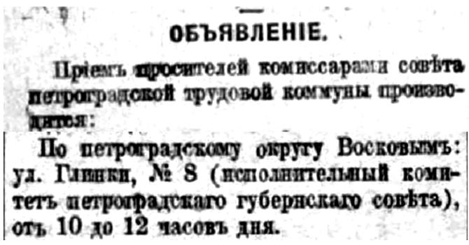 1923: 35-я Единая Трудовая школа I и II ступени Центрального р-на, ул. Глинки, 8.("Весь Петроград - 1923". С. 111).