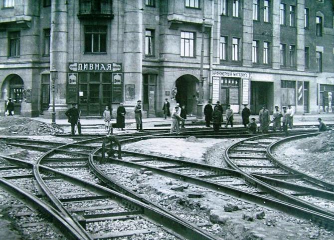 * Угловой фасад дома 36/2 по ул. Куйбышева и Чапаева. Фото 1944 год. Видно, что на колоннах стояли две статуи и вазы на фронтоне. Сейчас их нет ** Ремонт трамвайных путей, угол ул. Деревенской бедноты (Куйбышева) и Б. Вульфова (Чапаева).Фото 1923 г.